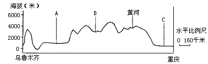 本题解析:本题考查我国的局部地理环境分布。(1)根据材料二显示,重庆人多地少,而新疆地广人稀。(2)新疆的气候类型为温带大陆性气候,气候干旱,降水少;但对农业生产的有利条件是:光照强、温差大、夏季高温;由于本区气候干旱故水源不足是本区农业生产最大的限制条件。(3)结合剖面图上的地势高低。A表示塔里木盆地;B表示柴达木盆地;C表示四川盆地。(4)A地区的河流多为内流河,受冰川融水补给为主,故流量小,流量的季节变化大(夏季流量最大);由于沿岸为沙质土壤,故含沙量较大;地处温带,故河流有冰期;B地区的河流为外流河,以降水补给为主,由于亚热带季风气候,降水丰富,但降水的季节变化大,故河流流量大,流量的季节变化大;由于沿岸植被覆盖较好,故含沙量较小;地处亚热带,故河流无冰期。