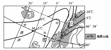小题2:本题考查等值线图的判读。甲处等温线往北凸出,说明甲地温度高于同纬度地区,附近有北大西洋暖流;乙处等温习往南凸出,说明乙处气温低于同纬度地区,乙处为斯堪的纳维亚山脉,地势高,气温低。所以本题选择D选项。