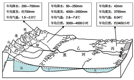 (2)图中甲、乙、丙三区域最可能形成大面积冲积扇的是_______,有大面积沙丘分布的是_______。造成黑河流域生态环境极度脆弱的主要自然原因是___________。(6分)
