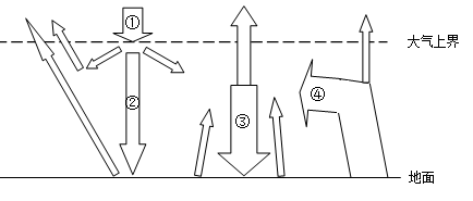 1、单选题 下图中各箭头及序号表示太阳、地面、大气、宇宙空间之间的热力作用,其中包括太阳辐射、地面辐射、大气辐射、大气逆辐射、大气的削弱作用,读图回答下列问题。