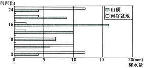 5、单选题 如图为某地区山顶与相邻河谷盆地降水量日变化柱状图,读图回答问题。