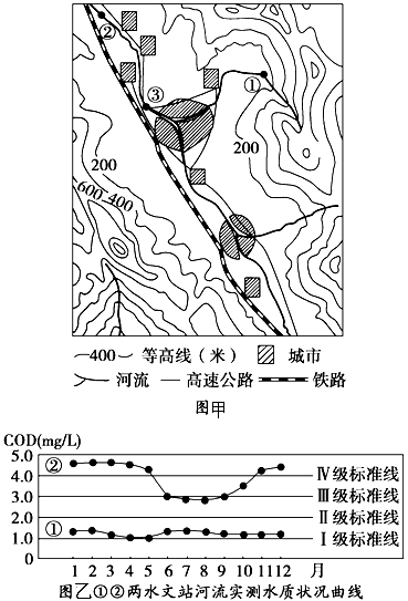(2)据图乙,描述②处河流水质随时间变化特点并分析原因。(4分)