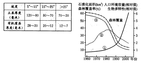 材料二?表列出我国西南某地区坡度与土层厚度与有机质层厚度的实测数据,图为石漠化与森林覆盖率、生物多样性、人口环境容量的统计图。