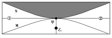 2、单选题 下图所示区域在北半球,弧线M为纬线,弧线N为晨昏线,阴影部分为黑夜;甲乙两地所在经线的经度为120°E;甲地此日正午太阳高度为40°。读图回答问题。