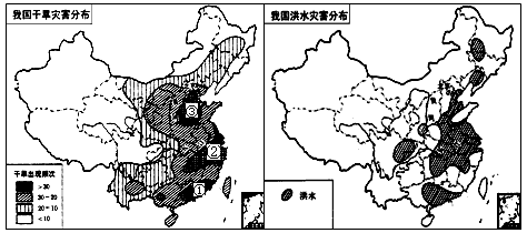 3、综合题 阅读我国干旱灾害分布图和洪水灾害分布图,回答问题。