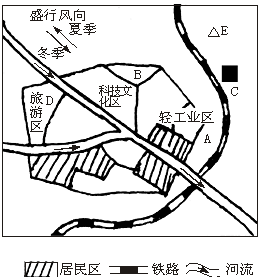 该城市规划拟建电子工业基地、钢铁厂、火电厂、疗养院、绿化带,请你帮助设计合理的位置(A~E处)。