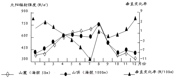 本题解析:从图中可以看出,每年9月份到次年4月份,山顶太阳辐射大于山麓,4-8月份山麓太阳辐射大于山顶,8、9月份山麓和山顶太阳辐射差别不大。1-8月份,山麓太阳辐射一直增大。9-12月份,山顶太阳辐射先减小,再增大,在减小。