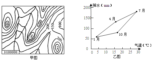 2、单选题 下面甲图为某地区等高线地形图(等高距单位:米),下面乙图为该地区多年平均的气候要素资料。回答下面各小题。