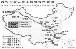 材料一? 2008年初,世界最长的跨国天然气管道西气东输二线工程正式开工。该工程外连土库曼斯坦的中亚天然气管道,西起我国霍尔果斯,南至广州、深圳和香港,是世界上最长的跨国天然气管道,将国内外天然气输送到珠江三角洲、长江三角洲,其意义重大,影响深远。