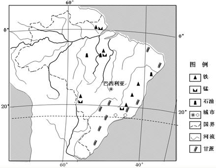 (1)该问考查世界能源问题,解决能源紧张状况的方法,同时考查了工业区位,主要考查考生读图能力和调动和运用知识分析问题的能力,主要从巴西的原料、化石燃料状况及市场三个角度来回答。结合图例读图可知,巴西缺乏石油、煤炭等燃料能源,加上经济快速发展,人口增加,工农业生产、居民消费对能源的需求越来越大,生产乙醇可以缓解燃料能源紧张的状况,巴西甘蔗产量大,为生产乙醇提供丰富的原料,所以巴西大量发展生产乙醇。
