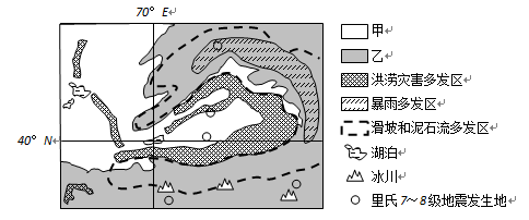 依据图中信息,推断图例甲、乙分别表示的地形类型,并说明甲、乙两类地区分别应采取的防灾减灾措施。
