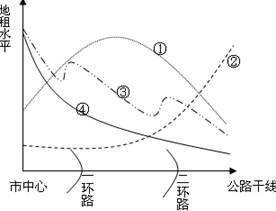 1.该图四条曲线中,能正确表示地租从市中心向外变化的是:2.影响该城市地租从市中心向外变化的因素是: