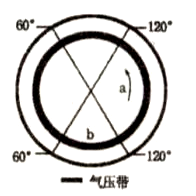2、单选题 图为“以极点为中心的半球示意图”,图中箭头表示地球自转方向。读图,回答问