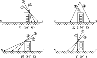 【小题2】根据图示太阳高度大小判断,②应为两分的正午太阳光线,从四地②的正午太阳高度大小比较,由大到小应为乙、甲、丁、丙,正午太阳高度越大,楼间距越小。故选B。
