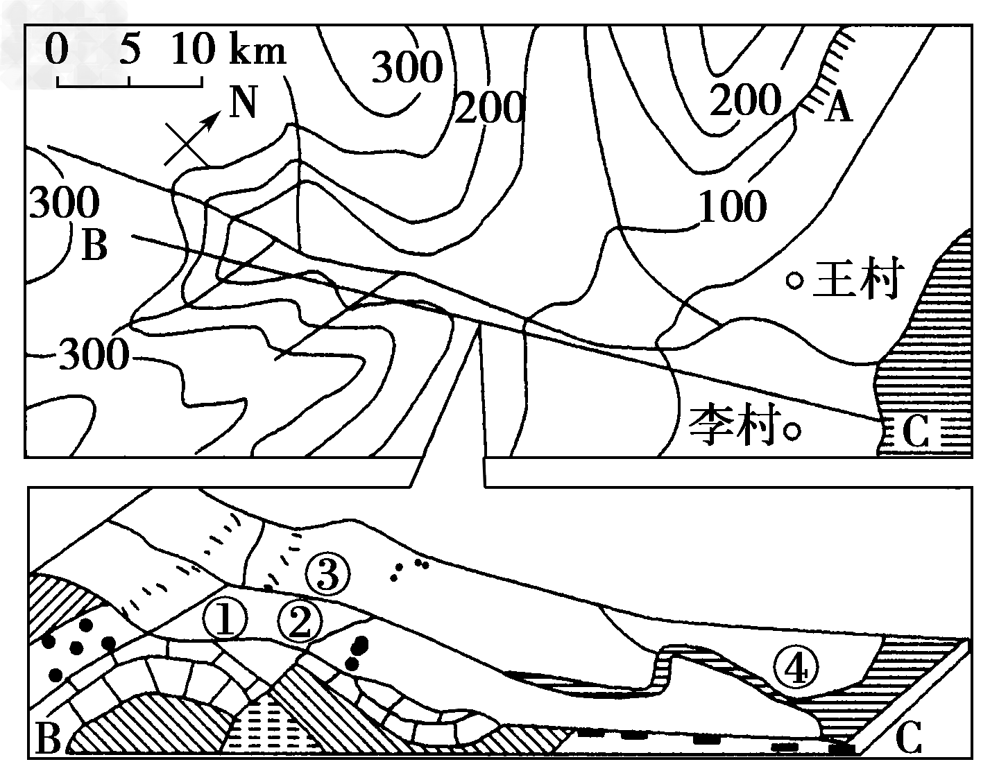 (2)沿剖面线BC的地质剖面图中①②两处发育成河谷的原因是:①____________________________________________________; ②___________________________________________________?。