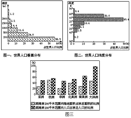 (3)分析图三,在距海岸200千米范围内,陆地总面积占洲总面积小于30%的大洲中,人口占洲总人口
