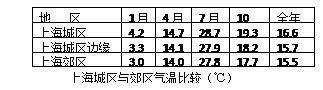 5、单选题 读上海城郊间气温差异情况表和上海城区、郊区降水分布图,完成各题。
