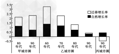 D.90年代,与丙城市圈相比,甲城市圈城市化速度快、水平较低