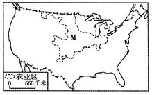 1.M区域地处美国中央大平原,地形平坦,地广人稀,农业地域类型是商品谷物农业,种植的农作物主要是小麦和玉米。