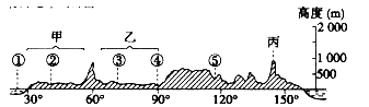 小题1:由图中60°E的东西两侧都以平原为主,再结合所学的关于俄罗斯的相关地理知识可以判断图中的甲为东欧平原,乙为西西伯利亚平原。再结合图中国家所跨经度最多。由此可以肯定图中的剖面是沿俄罗斯境内的某一纬线做的一个东西向的剖面图,再结合所给的选项,只能选B。