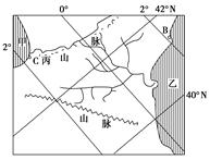 1、单选题 读沿某纬度所作的地形剖面示意图,当北半球夏至日时,甲地的正午太阳高度角为43°08′,回答21~22题。