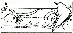 小题2:B洋流的成因是___________,与同纬度北半球海区比较,B洋流水温较低的原因是___________。