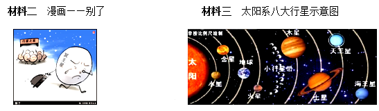 材料一 北京时间8月24日晚间,在捷克首都布拉格召开的26届国际天文学联合会闭幕大会上,2500位来自不同国家的天文学代表对四个关于确定太阳系行星身份的草案进行投票表决后决定,冥王星失去“行星”地位,被划为“矮行星”。这意味着,太阳系将只有八个行星。