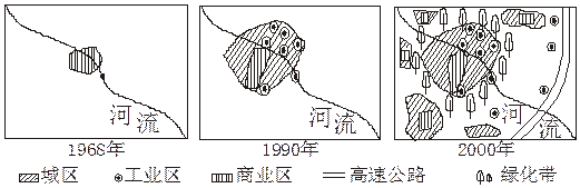 5、综合题 下图为“某大城市1968年、1990年、2000年的同比例尺平面示意图”,比较三图回答问题。