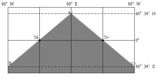 (2)根据图示:北极圈及其以北地区出现极昼现象,所以直射点的纬度为23°26′;根据90°E地方时为0:00,直射点的地方时为12:00,经度为90°E。