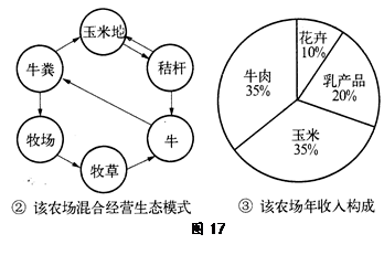 (2)读图17,该农场的经营模式对应图16中的?(甲、乙、丙),这种模式有利于获得良好的经济效益和?效益。该农场的年收入是变化的,影响其变化的主要因素是?。