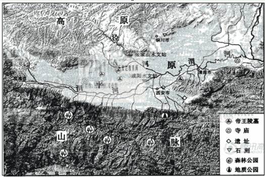 旅游资源主要分成两大类:自然和人文旅游资源。从图例的分布位置来看,北部主要分布人文旅游资源,南面山区主要分布自然旅游资源。影响河流泥沙的含量主要有:植被、地形地势、土壤结构、暴雨等因素。黄土高原面临最大的生态环境问题是水土流失,防治措施主要有工程、生物、农业技术措施。渭河平原的形成是在内、外力共同作用下形成的。秦岭是我国最重要的综合地理界线,自然地理界线意义应从气候、植被、水文、土壤等方面进行思考。
