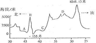 4、单选题 该图是沿我国一条经线所做的地形剖面图,横座标表示纬度,读图后回答问题。