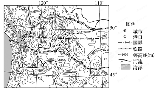 5、综合题 (15分)温哥华是加拿大冬季温暖的港口城市,是通往亚太地区的门户。自20世纪末以来,随着亚太地区经济的快速发展,加拿大中东部的农矿产品的出口越来越倚重温哥华港。读图,回答下列问题。