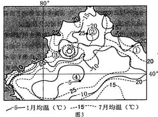 2、单选题 图3示意我国某区域一月和七月气温分布。读图完成9~10题。