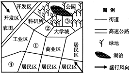 5、单选题 下图表示某区域城市分布图和该区域甲城市地租等值线示意图、该区域甲城市规划略图,读图回答各题。