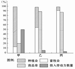 (6)图2中区域草类 ;地广人稀,而且土地租金很低;距 ?近的区位优势,促进了牧场的商品性经营。(2分)
