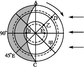 (4)在乙图中画出此时另一个半球的黑夜范围(涂成阴影)。(3分)。