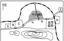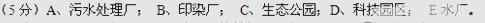 5、综合题 (5分)某城市将建印染厂、水厂、污水处理厂、科技园区和生态公园。下图中的A、B、C、D、E五处可供选址,该地盛行东风。读下图,在横线上分别填上工厂名称。