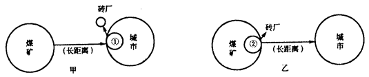 小题1:甲图中的火电站离煤炭产地比较远,而是在城市附近,所以A选项中的甲图火电站并没有减小资源的运输压力,A选项错误。乙图中的火电站离城市较远,为了防止火力发电造成城市污染,B选项错误。砖厂利用发电厂的废渣为原料,实现了污染物、废弃物资源化,是减少了“三废”污染,C错误。两种模式的火电站是为了缓解城市资源紧张状况,D选项正确。