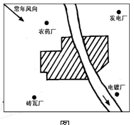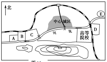 5、综合题 (10分)某城市将建化工厂、水厂、污水处理厂、科技园区和生态公园。下图中的A、B、C、D、E五处可供选址,该地盛行风向是东风。读图回答问题。