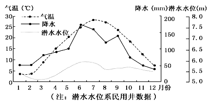 3、单选题 下图是某地气温、降水、潜水水位(潜水面海拔)年内变化图。读图,回答下面问题。