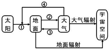 1、单选题 下图为大气热力作用示意简图,①②③④分别表示太阳辐射、地面辐射、大气逆辐射和大气削弱作用。据图完成下列问题。
