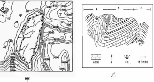 (2)读乙图在地质构造上,A为?、B为?。地下水补给区的地形为?,该地区在温暖湿润气候条件下易形成?地貌。(4分)
