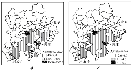 2、单选题 下图甲、乙分别示意京津冀都市圈2000年人口密度分布和人口增长率。完成各题。