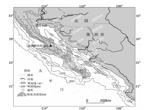 (1)描述等值线空间分布特点,一方面向线的走向(即延伸方向),另一方面就疏密。由图可知东南---西北走向;较密。说是地势较陡。结合板块分布可寻找到,处于美洲板块与太平洋板块交界处,碰撞较强。