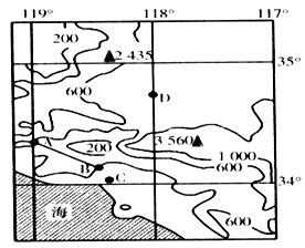 1、综合题  读世界某地的等高线分布图,三角形代表山峰,回答下列问题。