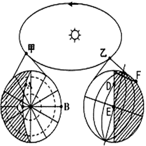 3、综合题 读“地球在公转轨道上甲、乙两处的昼夜分布放大图”,回答下列问题。(12分)