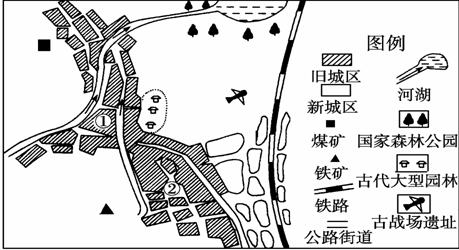 (1)本题考查城市区位因素。影响城市的区位因素有自然因素和社会经济因素。其中自然因素包括河流、地形、气候等;社会经济因素包括资源、交通、政策等。该城市旧城区布局的主要区位因素是河流和煤铁资源。