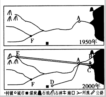 (2)对比两图可以看出,到2000年该地形成了5个城市,这些城市可能的发展条件是:A____________;