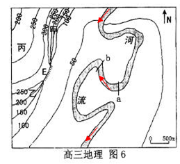 第1题,根据等高线变化趋势可知该区域河流总体流向为由北向南(如下图所示),又因为该区域河道特别弯曲,故可推断ab段的流向为自东南向西北(如下图所示)。